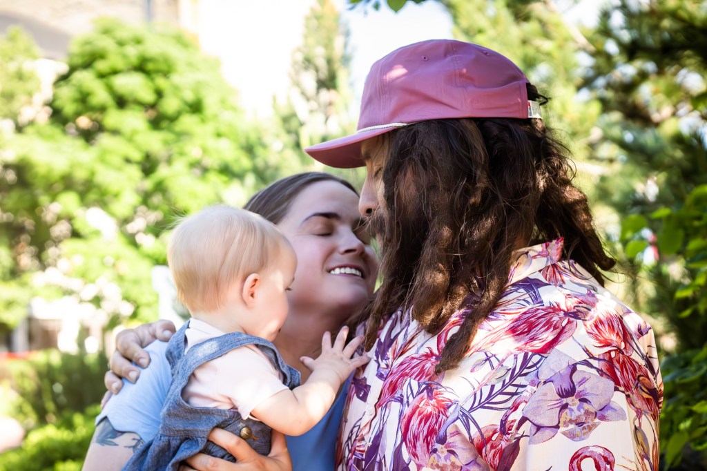 Wardrobe: The three of them came waltzing along the pond to meet me in their soft pastel pink and blue. The sun shone down on them in dappled rays of beauty that quite complimented the the love emminating from their sweet countenances. They nervously unpacked their beetle, adjusted their baby girl and setup her stroller. They looked at eachother. Then at me. Then back at each other mumbling directions to one another about how best to situate themselves before the photoshoot began.